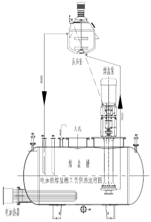 正常生產(chǎn)中,熔鹽介質(zhì)經(jīng)熔鹽槽內(nèi)的電加熱器,加熱到一定的溫度后由熔鹽泵輸送給熔鹽換熱器,將熱量傳給熔鹽換熱器內(nèi)的物料,放熱降溫后自流回熔鹽槽,熔鹽槽內(nèi)的電加熱器不斷的對熔鹽介質(zhì)加熱,再經(jīng)過熔鹽循環(huán)泵強制液相循環(huán)將熔鹽介質(zhì)的溫度傳送給熔鹽換熱器內(nèi)的物料,周而復(fù)始循環(huán),熔鹽槽內(nèi)的電加熱器不斷的在加熱,熔鹽泵不停的工作,被加熱的熔鹽介質(zhì)不斷的循環(huán)流動,熔鹽換熱器內(nèi)的物料不停的吸收熱量,直到熔鹽換熱器內(nèi)的物料達(dá)到工藝溫度后,再停熔鹽泵,熔鹽介質(zhì)通過熔鹽的自重回到熔鹽槽中。