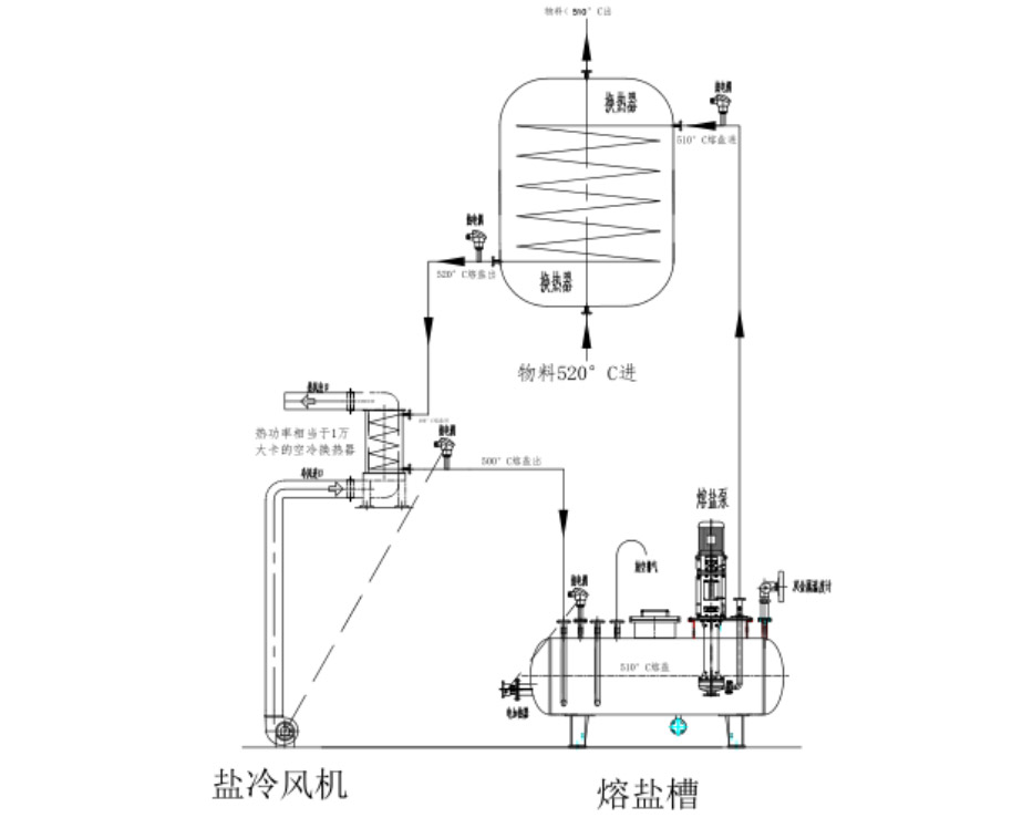 配置由:熔鹽槽電加熱器、熔鹽槽,熔鹽泵、熔鹽空冷換熱器,鹽冷通風(fēng)機(jī),電控柜,現(xiàn)場一次儀表組成。